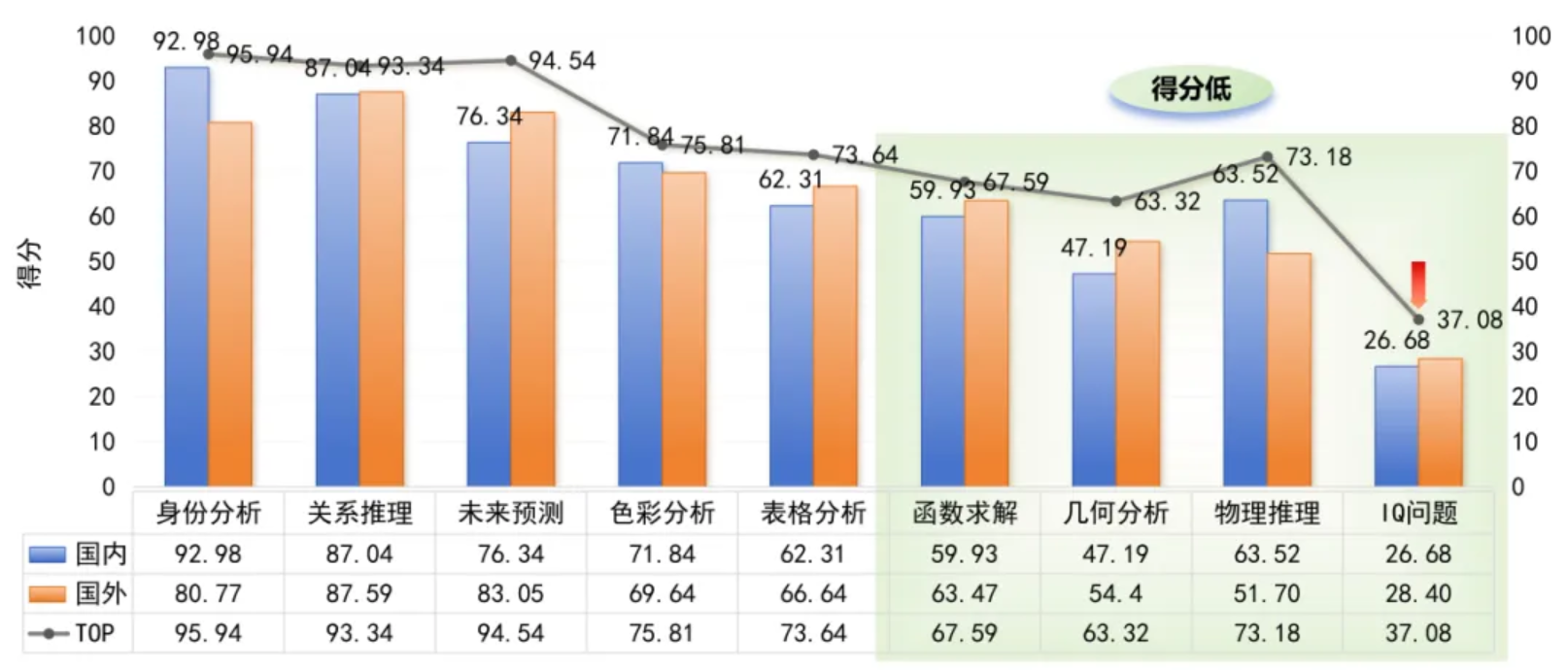 本期测试9类指标,不同维度能力差异明显:从全球模型的整体水平来看,其在身份分析、未来预测、色彩分析等基础任务达到较高能力水平,而函数求解、几何分析和IQ问题等复杂学科、高强度推理任务上仍存在瓶颈。从国内模型的表现来看,其在身份分析、色彩分析、物理推理这类规则明确的任务中表现突出;但未来预测、IQ问题这类涉及开放推理、长程逻辑或场景推演的任务上,仍有较大提升空间。