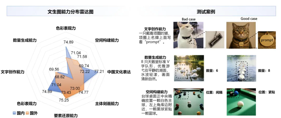 在图像生成能力方面,国内模型在色彩表现、要素还原能力和中国文化表达维度优于国外模型。这一结果表明国内模型在高精度控生成的技术沉淀,也体现出其深耕本土市场数据、适配文化审美偏好的训练路径。然而,当前模型在文字内容生成、数量一致性保持及空间构建等方面仍存在局限,如文字生成易出现细节偏差、数量控制稳定性不足、空间布局与物体关系构建能力亦有欠缺。整体来看,模型对单一元素类指令的执行效果较好,但在“数量-空间位置-物体关联”等复合指令的处理上,仍有较大提升空间。