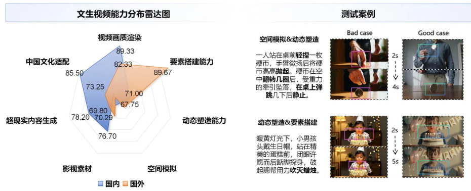 在视频生成能力方面,国内模型在中国文化适配及影视素材生成两个维度的表现显著由于国外模型,体现出其在本土文化内容适配、影视级风格还原上的定向优化成果。国外模型则在空间模拟与要素组织等生成能力上保持一定优势。整体来看,当前模型在动作合理性、过程连贯性以及细节完整性等方面时常出现偏差,尤其在“物理逻辑-动态塑造-场景细节”等复合维度的融合生成能力上,有待进一步加强。